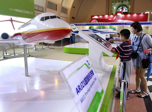 6月26日,一位家长带着孩子在展会上参观ARJ21飞机模型。