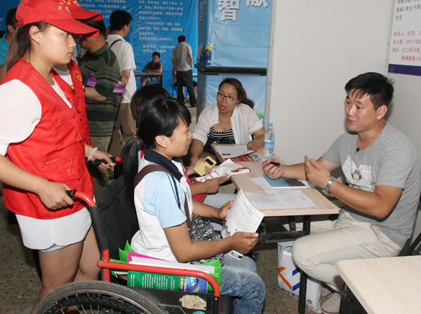 6月29日,一名求职者(前左二)在首届京津冀残疾人就业(创业)洽谈会上求职。
