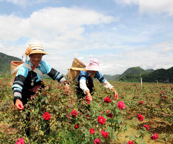 6月29日,云南丘北县八道哨村的两名白族妇女在采摘玫瑰花。