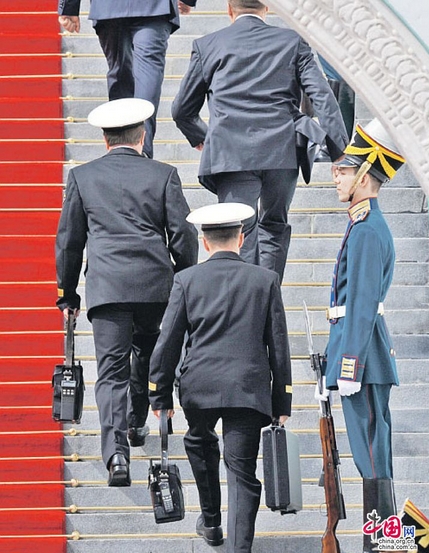 俄“核提箱”由紧随总统的海军军官携带,这一风尚源于戈尔巴乔夫的夫人赖莎,并沿用至今。