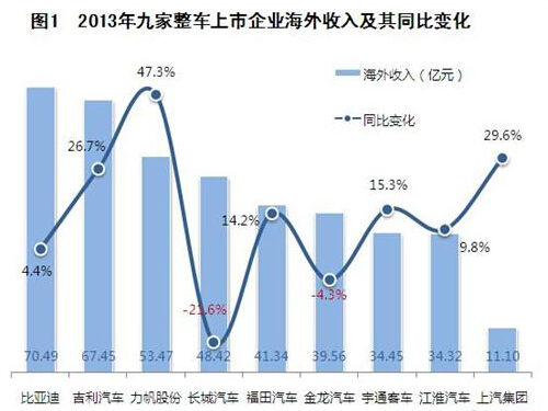 14家企业中,2013年海外收入超十亿元的仍有九家企业,依次是比亚迪、吉利汽车、力帆股份、长城汽车、福田汽车、金龙汽车、宇通客车、江淮汽车和上汽集团。其中,力帆汽车的海外收入同比增长47.3%,为各车企之最。