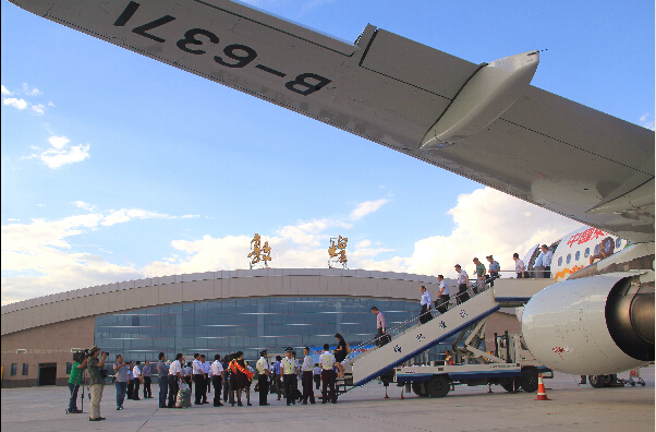 6月30日,“绚丽甘肃”号客机降落在敦煌机场,乘客走出机舱。