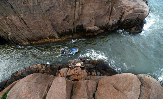 买只小船,置办一些廉价的设备,再雇一名船老大。4点起床,5点出海,太阳出来时,捞螺人已在各种岩石、海沟边开始作业了。嵊山弯曲的海岸线比较适合螺类的聚集,船老大开着船,在捞螺人的判断下寻找海沟里的黄螺。