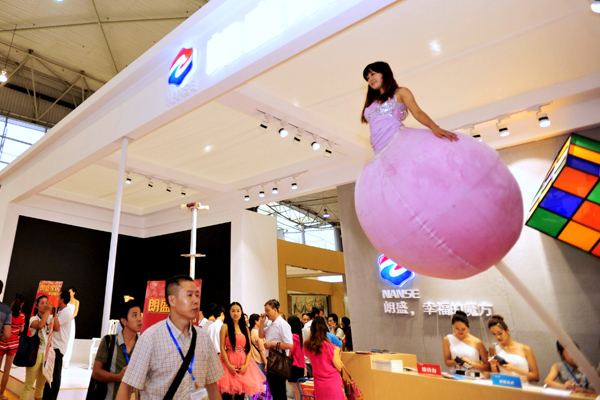 成都国际家具展开幕 “奇葩促销”吸引眼球。 7月3日,以“中国平台全球共享”为主题的第十五届成都国际家具展览会在成都开幕,本届展会展出总面积突破17万平方米,展位总数首破1万个,参展企业达1100余家,其规模为历届之最。参展商家的新奇促销手段让参观民众目不暇接。图为参展商家的新奇促销手段。
