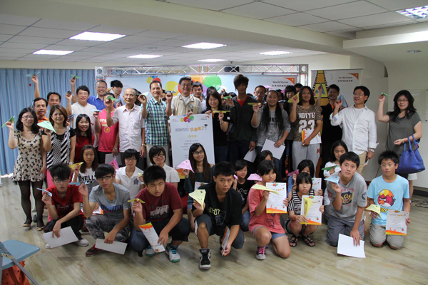 台湾世界展望会彰云嘉区办事处5日安排今年毕业的受助学生与资助人见面,共同举起手中的纸飞机,象征「飞向梦想、鹏程万里」。