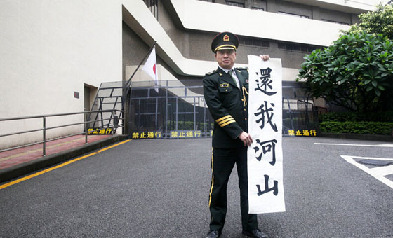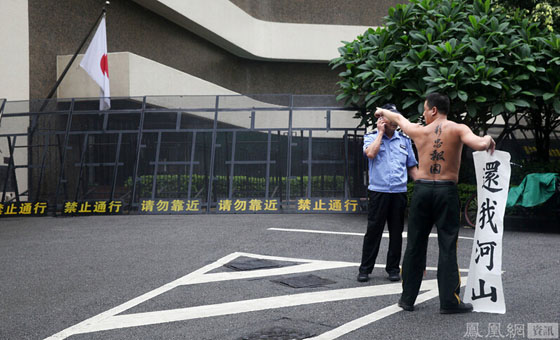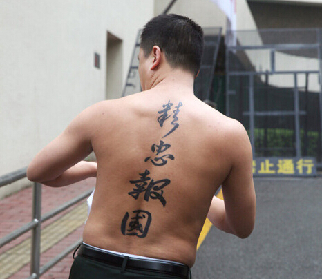 刘强原本穿着一套从广州战士歌舞团订做的07式军礼服(它的现实功用,是“新四军后代合唱团演出礼服”),此刻身上剩的一件白衬衫被广州6月份的天气溻湿了贴在脊背上,隐隐透出一周前刚刚文上去的“精忠报国”四个字。20分钟前,他刚刚脱光了上衣,在花园酒店的门前展示了这件新作,以及其他几幅写在宣纸上的书法作品——“日本谢罪”、“中华崛起”。此前还有几次,他边展示边唱歌,边用手指向斜插在不远处的日本国旗——偶尔还会做出手枪的手形。