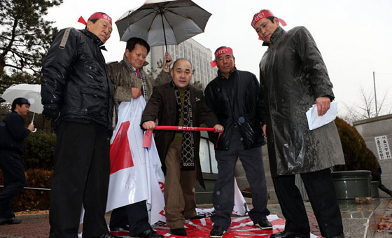 这是2012年底,韩国首尔,韩国反日团体在高等法院外示威,要求当局拒绝向日本引渡中国人刘强的要求。日方要求韩方将刘强作为罪犯引渡到日本受审,中国则要求把刘强作为政治犯处理并将其遣送回中国。刘强在接受庭审时表示,自己向靖国神社放火完全是出于对日本军国主义分子反人类罪行的抗议和示威。