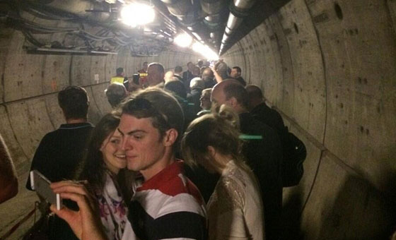 英法海底隧道地铁发生电力故障,乘客等待救援时在现场自拍。
