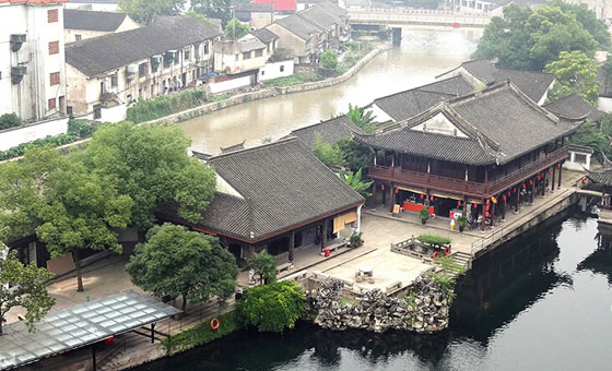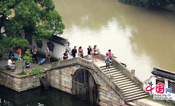 2014年7月7日中午,许多游客们正在风景如画的浙江绍兴市东湖风景区内游览美景。从高处向外眺望,一墙之隔的浙东古运河,由于被上游洪水污染而呈黄色,但是墙内的东湖水却是黛青色,水质清澈,鱼翔浅底。两者形成明显反差。
