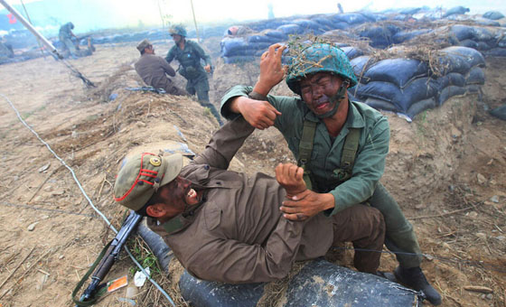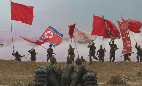 去年9月13日,韩国军队在倭馆铁路桥附近打扮成朝鲜士兵的模样,重新上演洛东江战役,以纪念朝鲜战争结束63年。
