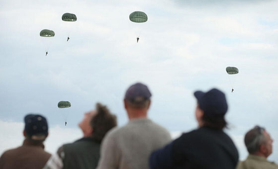 6月5日,在法国,观众正在抬头观看跳伞。今年的6月6日为登陆诺曼底70周年纪念日。
