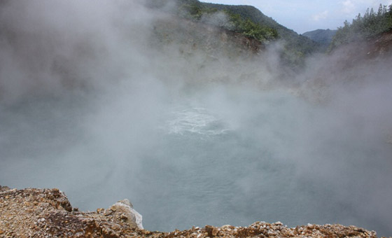 沸湖:沸湖位于加勒比海小安的列斯群岛的多米尼加岛上,藏身于岛南部火山区的山谷中。湖长不过90米,但是又陡又深,离岸不远处,湖水已深达90米。沸湖是由一眼间歇泉形成的。在湖底有一个圆形喷孔,当喷泉停歇时期,湖水因缺乏水量补给而干枯。然而一旦喷发,则地动山摇、群山轰鸣,热流从湖底涌出,湖面烟雾缭绕,热气腾腾,有时还会形成高达二三米的水柱,冲天而起,蔚为壮观,沸湖也由此得名。沸湖的这些热水是从哪里来的?原来,沸湖坐落在一个古火山口上,在地球深处的带有大量矿物质和含硫气体的炽热熔岩水,在上升时遇到古火山口通道,就会猛烈地向地表喷出,结果就形成了这个大自然的奇观。由于沸湖周围地区长期受含硫气体及其他一些有害气体的影响,动植物的生长繁殖受到很大影响,大片植被被毁,景色荒凉,所以被称为“荒谷”。