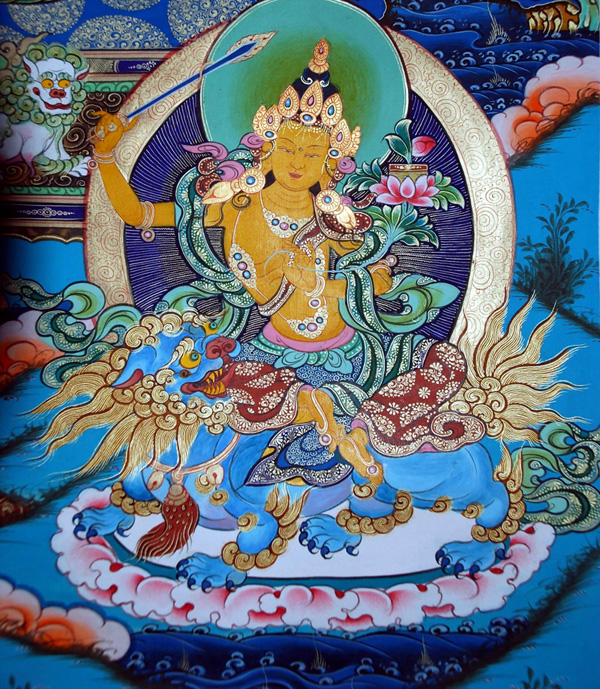 在眾多菩薩中智慧第一的就是「文殊菩薩」,他手持著寶劍,代表斬斷煩惱的慧劍;他的坐騎是一頭獅子,代表智慧的威猛。