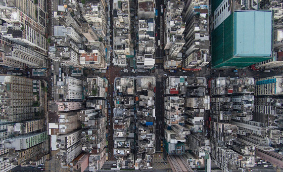 香港老居民楼密集的深水埗区航拍图。