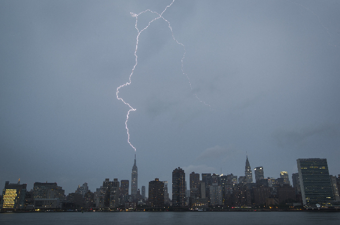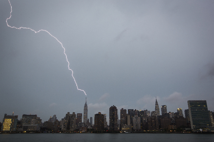 7月15日,一道闪电打在美国纽约曼哈顿的帝国大厦上。