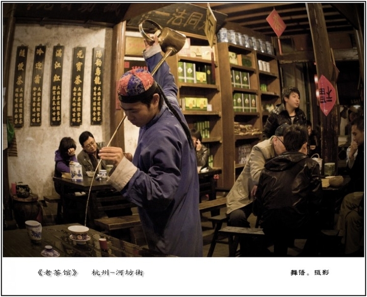 仰視一眼,便見整個茶廳屋頂,仿佛被歷久的灶烟燻暗似的,顯得格外深邃而幽遠,全然不見眼下都市茶館流行的那般廉價的靚麗與時尚。再看那條曲折逶迤的長廊高牆上,呈出一抹泛青夾帶著泛黃的色調,儼然一條蒼老的古巷。