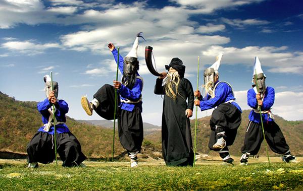 「撮泰吉」是一種古老的戲,其面具浸透了一種原始的積澱;前額突起,鼻子直長,以明顯的猿猴相勾勒了先民的印記。沒有眼珠和牙齒,只在相應的部位剜出孔穴以表示眼睛和嘴巴;沒有眼珠的空洞,似乎能穿透千年的歲月,人與神、生與死都變得模糊。單純、稚拙、懣憨、怪誕是「撮泰吉」面具的整體風格。閉上眼,那些頭戴尖尖帽、臉戴古老面具、手拄木棍的舞者一路緩緩行來,那動作是挖地、放牧或者是虔誠地向神祈求庇護。號稱千歲老人的若戛阿布、阿布摩、阿達姆、麻洪摩、哈布等人的嘴里發出低沉而富於穿透力的叫聲……
