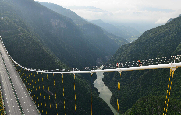 峡谷山风大、云雾多、谷底深,为保证大桥安全及相关设备的稳定运行,鄂西高速公路管理处第二养护站的两名90后养护工王勇和梁亚雄,常常需要爬上大桥两端锁塔之间的缆索(俗称“猫道”),查看一根根缆索、一处处防腐层、一个个螺栓是否有损伤,相关设备是否保养正常,确保大桥安全稳固。