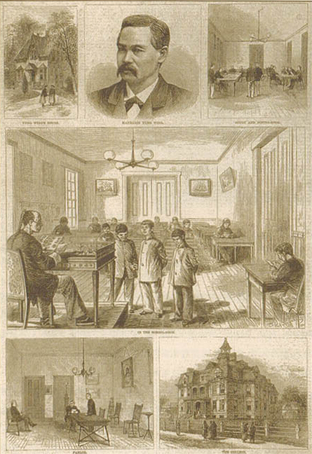 ▲1876年5月18日《哈巴周刊》所刊留美幼童在美情形。上为容闳,中为中国老师给幼童上传统文化课,下右为清政府在哈特福德建造的幼童出洋肄业局大楼。