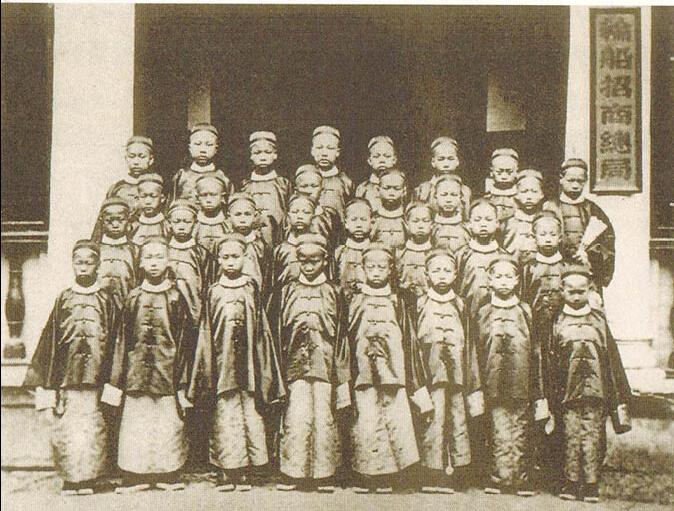 ▲第一批留美幼童1872年出发前在上海轮船招商局合影。