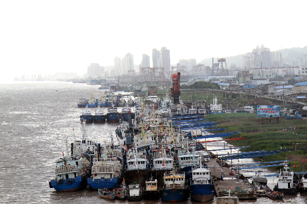 7月23日,渔船在浙江台州市椒江大桥附近避风。