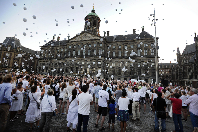 7月23日,在荷兰首都阿姆斯特丹,人们参加悼念马航MH17航班遇难者的活动时放飞气球。