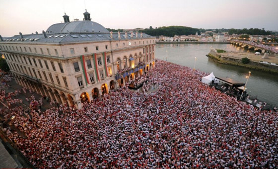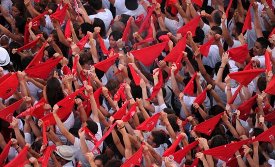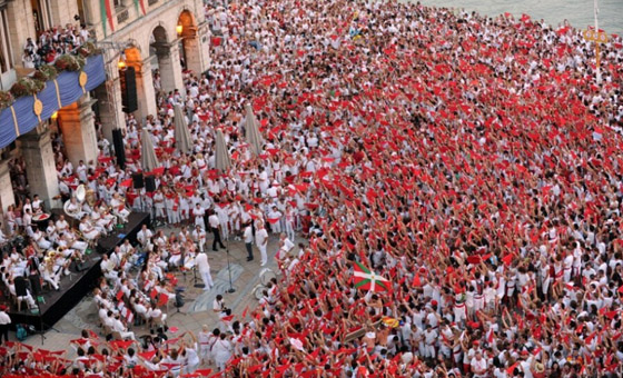当地时间2014年7月23日,法国巴约讷,数千名狂欢者高举红色围巾参加当地举行的巴约讷狂欢节。巴约讷每年夏季都会举办狂欢节,为期五天的狂欢将涵盖美食、运动、文化、音乐会、奔牛、和游行等精彩内容。