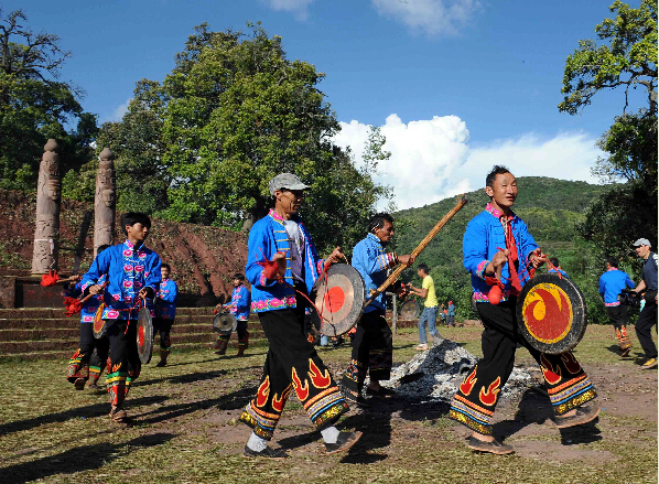 7月24日,云南省楚雄彝族自治州双柏县李方村的彝族群众在跳民间“大锣笙”。