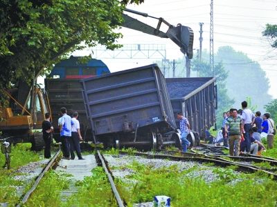 昨晚7时许,记者沿该铁路线步行2公里多,赶到现场时看到,铁路沿线两边杂草丛生,仍有两节偏离轨道的车厢停留在原地,抢修人员正用一辆挖机清理散落在铁轨旁的烟煤,两名身穿写有“武汉供电段”制服的工作人员正准备支起照明灯,以便夜间继续抢修。现场所有抢修人员面对记者的提问,均表示不清楚情况。
