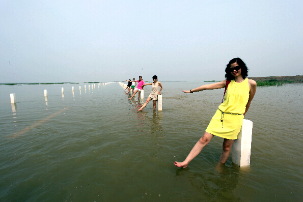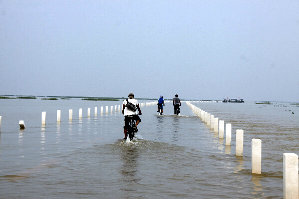 中国最大淡水湖鄱阳湖涨水 “水中公路”成胜景 。 江西省永修县城至吴城镇的大湖池段因鄱阳湖当前正处于丰水期,水位上涨没过公路,公路在水中隐隐约约,犹如一条蛟龙。公路两旁的白色护栏星星点点,宛如一条珍珠项链,形成一幅水天一色的美丽画卷。据了解,大湖池水中公路是永吴公路的一段,全长5.05km,为三级过水公路,于2013年11月下旬全路段双向全面开通。此公路的终点千年古镇吴城镇,途经着名的鄱阳湖候鸟保护区。