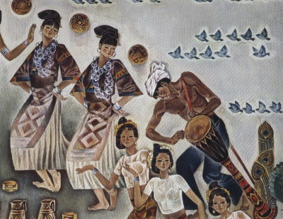 據說一年久旱不雨,某夜村中告翌仲老祖公在今天起鼓的地方挖井,不幸被倒塌的泥土掩埋,他託夢給子女說:「這個地方很好,就讓我在此長眠。」子女們便帶上香紙前去「墳」上祭奠,隨后便普降甘露,日后相沿成俗。還有一個傳說是:某年大旱,河水斷流,唯寨腳今天起鼓的地方有一水潭不乾,小孩們便到那里拊水嬉戲,但見潭中兩龍相斗,頓降大雨,方解燃眉之急,此后即變成節日。水鼓舞節至少有五六百年以上的歷史,苗語稱「zuk niel eb」,zuk niel意為踩鼓,eb意為水。水鼓節是為祈雨而生的節日,時間定在每年農历六月第一個卯日之后的第一個丑日舉行,節日分為「起鼓」和「踩鼓」兩個部分。