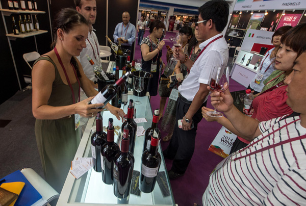 7月29日,参展商邀请参观者品尝葡萄酒。