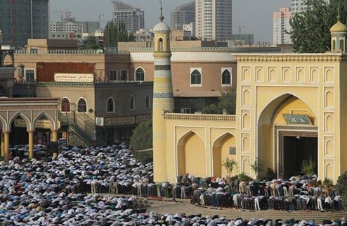 29日,喀什穆斯林群众赶往新疆最大的艾提尕尔清真寺参加聚礼。