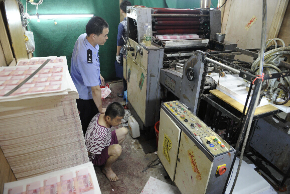 7月30日,广东省公安厅举行新闻发布会,通报广东警方成功侦破2014年以来中国内地首宗机制假币窝点案件,收缴假币9270万元人民币。据了解,广东警方在2014年上半年侦破百万元人民币以上案件假币犯罪案6宗,打掉分布于广东的揭阳和汕尾两市的伪造货币窝点3个,抓获嫌疑人57名,收缴假币1.27亿元人民币。图为警方6月27日在揭阳市端掉一个机制假币窝点,收缴假币9270万元人民币。(广东公安厅供图) 中新社发 钟欣 摄