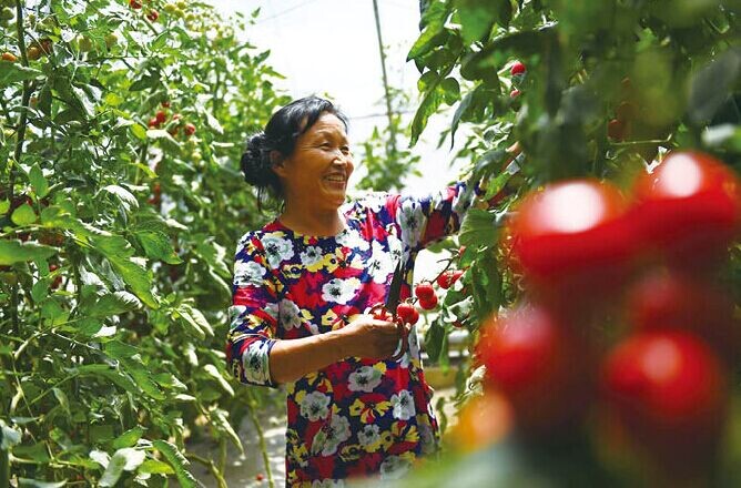 6月8日,河北省滦平县大屯满族乡农民在合作社大棚内采摘西红柿。