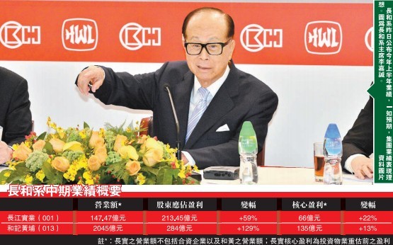 【香港商報訊】記者陳正偉報道:長和系昨日公布今年上半年業績,一如預期,集團業績表現理想,今年上半年,長實(001)以及和黃(013)盈利分別錄得213.45億元以及284億元,期內分拆港燈(2638)上市所得的一次性收益是推高集團業績的重要原因。值得留意的是,集團於內地地產業務較為放緩,但集團強調,不會在內地等相關市場「降價散貨」,「相信於合理時間內,其高級物業將可取得較佳售價。」