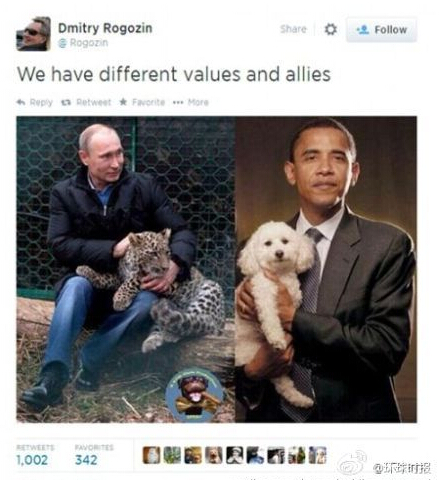 资料图:俄国副总理嘲讽奥巴马:你的宠物是狗,普京的是豹。俄罗斯副总理Dmitry Rogozin日前在他的Twitter账号发表了一张照片,嘲讽美国总统奥巴马。图中普京正在抚摸一头豹子,而奥巴马则抱着条小狗。这张图片配发的英文说明是:“我们拥有不同的价值观和盟友”。