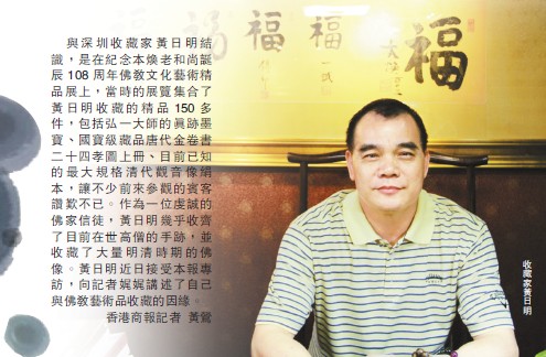 與深圳收藏家黃日明結識,是在紀念本煥老和尚誕辰108周年佛教文化藝術精品展上,當時的展覽集合了黃日明收藏的精品150多件,包括弘一大師的真跡墨寶、國寶級藏品唐代金卷書二十四孝圖上冊、目前已知的最大規格清代觀音像絹本,讓不少前來參觀的賓客赞叹不已。作為一位虔誠的佛家信徒,黃日明幾乎收齊了目前在世高僧的手跡,并收藏了大量明清時期的佛像。黃日明近日接受本報專訪,向記者娓娓講述了自己與佛教藝術品收藏的因緣。香港商報記者黃鶯
