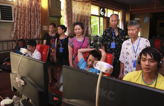2013年,在冰封十年后,文化部宣布解禁单体网吧的审批。然而,政策支持也难以挽回网吧行业的低迷。图为2014年8月5日,四川泸州,合道街社区的义务老年网吧监督队队员在一网吧内巡查。