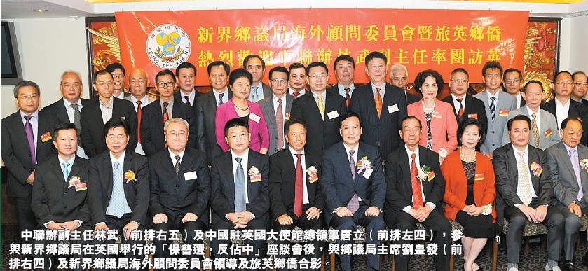 【香港商報訊】記者周駿報道:新界鄉議局除動員新界27鄉村民參與「保普選·反佔中」運動,更協助將宣傳延伸海外,通過「新界鄉議局海外顧問委會歐洲聯絡處」,把「保普選·反佔中」信息傳遍海外華人。鄉議局主席劉皇發藉訪歐聯誼期間,在倫敦逗留時向鄉僑詳述了「佔中」的危害,而鄉僑近期將會響應網上簽名「反佔中」及其他活動,新界27個鄉事委員會亦已收集兩萬餘份村民「反佔中」簽名書。