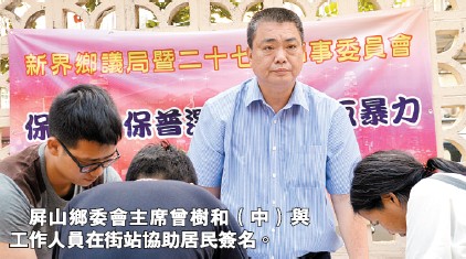 屏山鄉鄉事委員會由主席曾樹和帶領屬下委員共設立3個街站,分別在該會會址、元朗朗屏朥天橋上及元朗橫洲東頭圍村內,秘書處亦通知屬下村代表到會址取簽名表格,呼籲村民簽署,並分別於十個鄉村地點展示有關宣傳橫額。當日參與簽名支持的人士,多為成年人士,亦有家長帶領其子女簽署。截至8月2日約千多人參加簽名運動,仍有約千多張表格未交回。屏山鄉委會指反對「佔中」的簽名運動,得到各村代表、村民及市民的積極回應和支持,足以證明今次行動是成功的。而沙田鄉委會主席莫錦貴表示,至今已收集逾千市民簽名。
