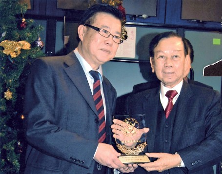 2011年12月19日乡议局到访英国糧船湾游欧同乡会,刘皇发赠送纪念品给江水生