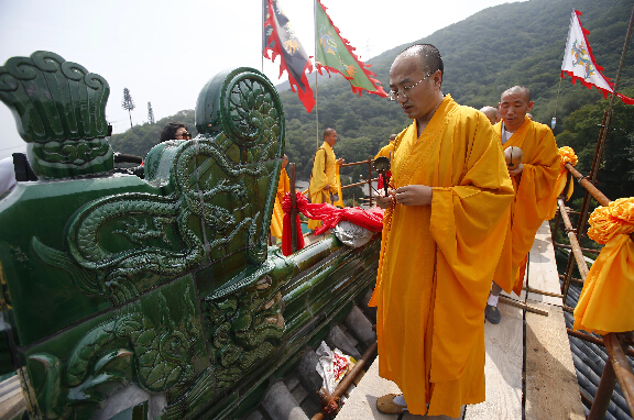 8月8日,北京戒台寺景区对正在复建的主体建筑──千佛阁,进行土建工程屋面封顶仪式。复建后的千佛阁,宽21米,进深24米。为典型三檐阁楼式建筑。全阁分上下两层,共计1680尊佛像,工程预计2015年10月竣工。始建于辽代咸雍年间的戒台寺千佛阁内因供奉1680尊木雕佛像而闻名于世,由于年久失修被定为危险建筑,于1965年经北京市政府批准拆除,进行落地保护,2011年千佛阁复建工程启动。图为僧人在为封顶做法事。