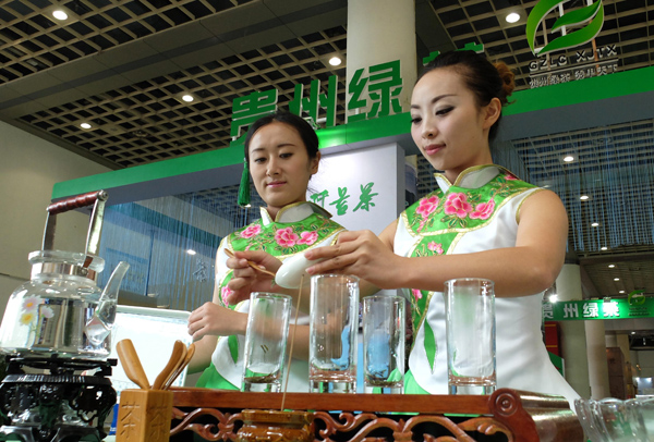 8月8日,来自贵州的茶叶公司工作人员在展位上表演茶艺。