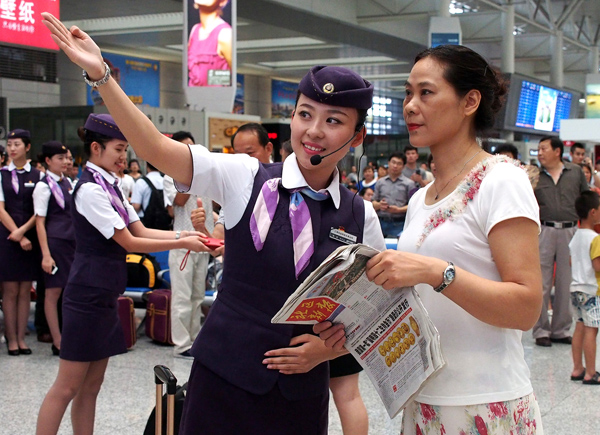 8月7日,高铁乘务员在火车站候车大厅表演服务旅客的小品。