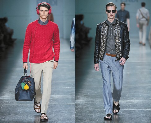 2015年春夏男裝系列網羅基本男裝款式包括拉鏈束腰外套、乾濕褸、修身西裝、貼身西褲和slim fit剪裁的恤衫;除此之外另有牛仔褸及百慕達短褲等休镕款式。看起來極似噴沙牛仔布的面料實際上是印花皮革。這項嶄新技術的結晶利用黏膠加工營造出恍如橡膠的質感。而鋪陳在束腰短夾克上的電腦點陣圖案,恍如細小的guanteria皮革馬賽克圖案,又似精巧的藤織工藝,令人看不透它的本來面目,只赞叹別致設計。此外,皮草細節令衣飾更添質感。織花布料則展現出實用的特色。無襯裡設計令輪廓更輕靈流麗,充滿細節的內櫳與衣服表面同樣予人驚喜。一抹鮮明的原色浮現於富節奏感的條紋、緊湊的棉布褶T或男裝袋上的吊飾中,為系列添上明媚的氣息。系列主打經典夏日色調卡其、米白、清爽的淡藍色調、力量與型格的靛藍、簡約淡灰。面料一如既往洋溢着FENDI獨有的奢華氣息,卻又不失實用風格,采用包括Cuoio Romano羅馬皮革、黏合皮革、鱷魚皮、織花棉布及亞麻棉布等。逃避主義在配飾系列中發揮得淋漓盡致:附鱷魚尾吊飾的Selleria背囊、民族圖案Peekaboo男裝袋、涼鞋及便鞋。赤足的西裝造型寫下終極的個性宣言。品牌與Beats by Dr. Dre合作設計的耳筒,以珍稀的Selleria或鱷魚皮革縫制,備有多款繽紛色調,為FENDI春夏系列傳送精采配樂。全系列耳筒將於2014年底推出。