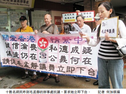 另外,約10名來自「關愛香港、情繫中華」群組的網民帶同橫額,昨午到立法會議員毛孟靜位於美孚的辦事處,抗議她涉嫌收取黎智英50萬元「政治黑金」,強烈要求她立即「落台」。他們又直斥她在「死鸡撐飯蓋」,在證據面前仍不承認自己有收受「捐款」,抗議人士在其辦事處門外大叫「孟靜唔净、貪婪成性」、「死鸡撐飯蓋、市民好憤慨」等口號。