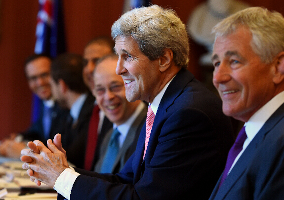 当日,澳外长朱莉·毕晓普、澳防长戴维·约翰斯顿、美国国务卿约翰·克里、美防长哈格尔出席澳美部长级定期磋商会议,美澳双方正式签署一项为期25年的协议,允许大约2500名美国海军陆战队队员和其他美军人员轮驻澳大利亚北部城市达尔文并进行训练。新华社/美联