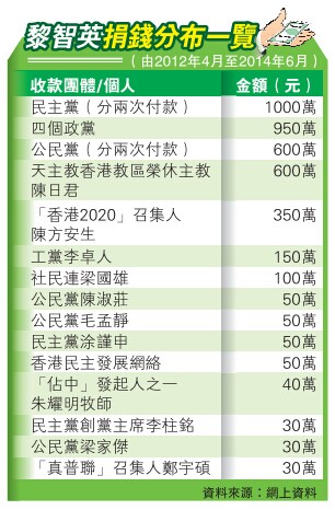 黎智英在過去2年向泛民議員及多名人士捐贈高達4000萬元獻金,而近期又不斷有反對派鼓吹「占領中環」。