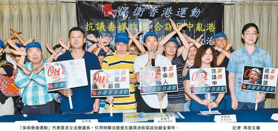 【香港商報訊】記者王卓軒報道:5名泛民議員早前被揭發收受壹傳媒集團主席黎智英的捐款均未有申報!團體「保衛香港運動」表示,涉事議員聲稱捐款是「袋住先」或「代政黨收取」等一系列藉口,都不足以推翻他們違規的事實,要求立法會議員引用特權法徹查事件。團體發起人傅振中表示,將在8月17日下午2至4時,在銅鑼灣鵝頸橋下擺街站反對「黑金政治」,及收集市民簽名,在立法會復會后遞交簽名并在會外抗議。他說,若涉事議員沒有得到應有懲罰,會考慮向法院提出司法覆核及約見律政司,直至事件真相大白。